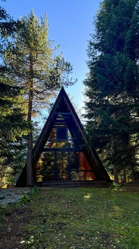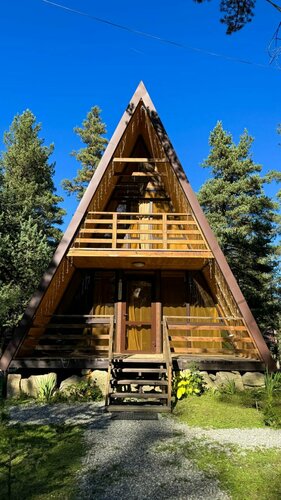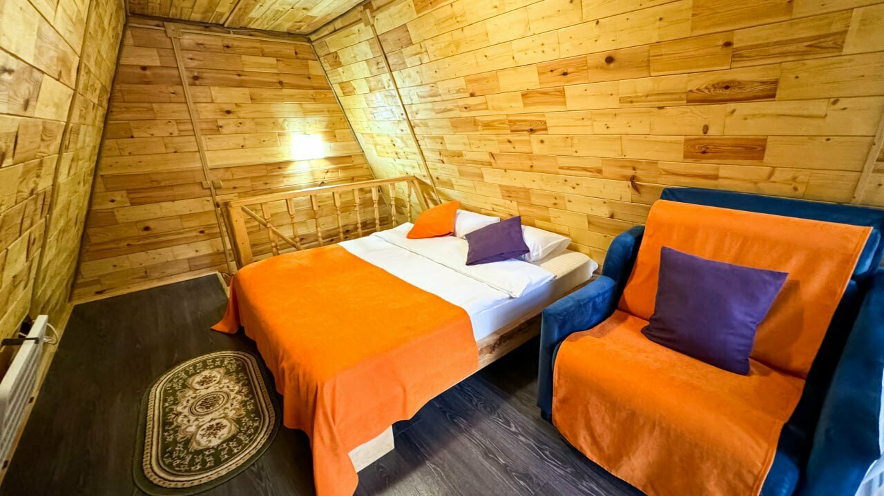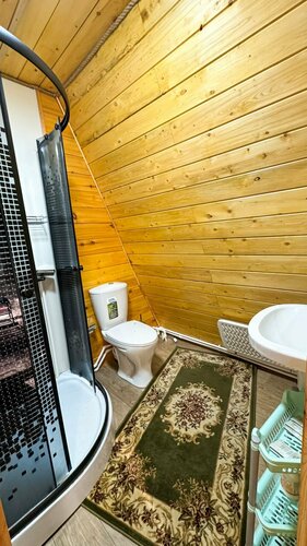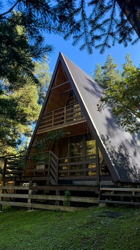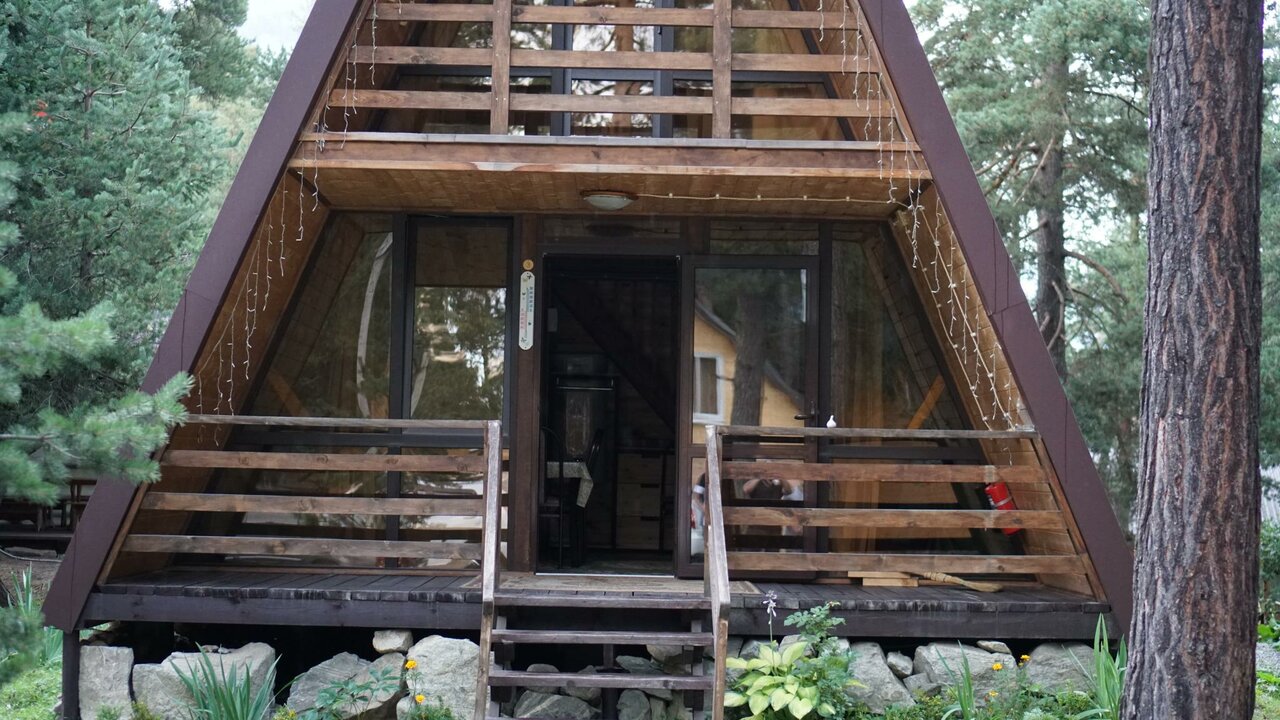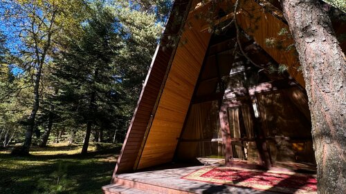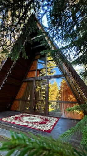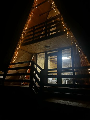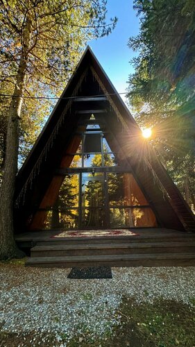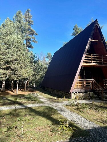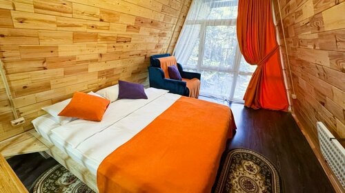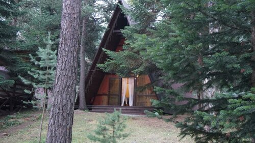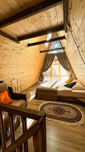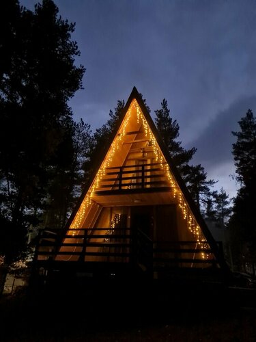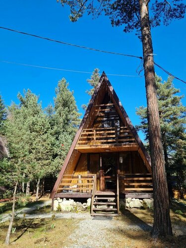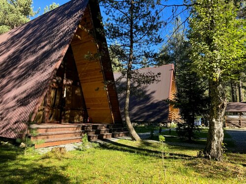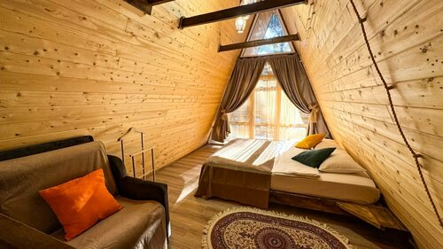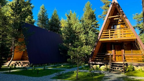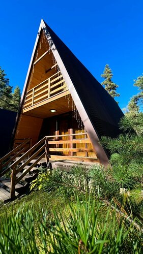 Треугольные домики, на 2 семьи, с двуспальный диваном на первом этаже и двуспальной кроватью на втором. Так же есть ещё одно спальное место - раскладное кресло на втором этаже. Для любопытствующих подойдёт домик с выходом на дорогу - целый день, кроме ночи приезжают квадрациклы, другие домики выход на другую сторону. У каждого домика есть беседка и на все домики место с костром с креслами - лежаками. Очень уютно. Самое спокойное и удобное место к основной дороге, неподалеку есть продуктовый магазинчик. В августе шишкопад, дорога песочная, пыльная, несколько раз в день увлажняют из шланга. Место одно из лучших.