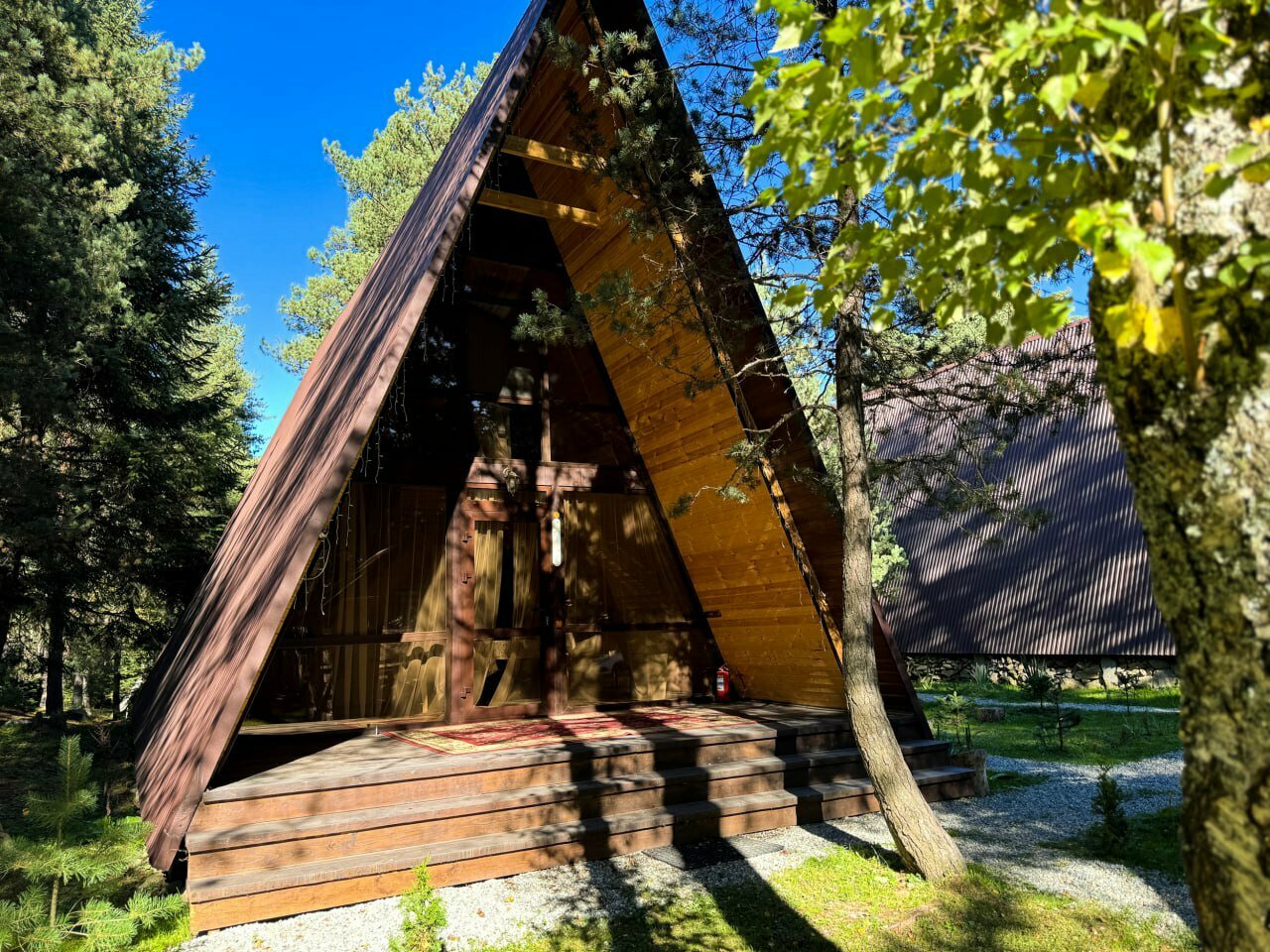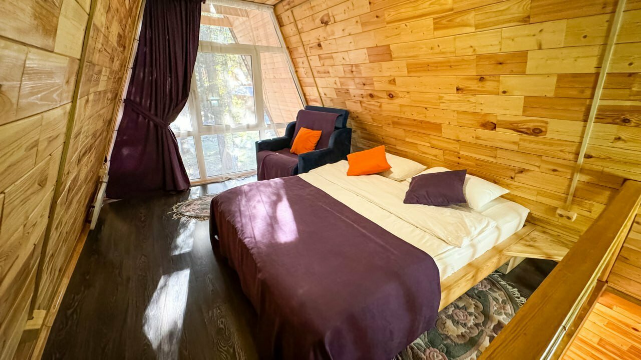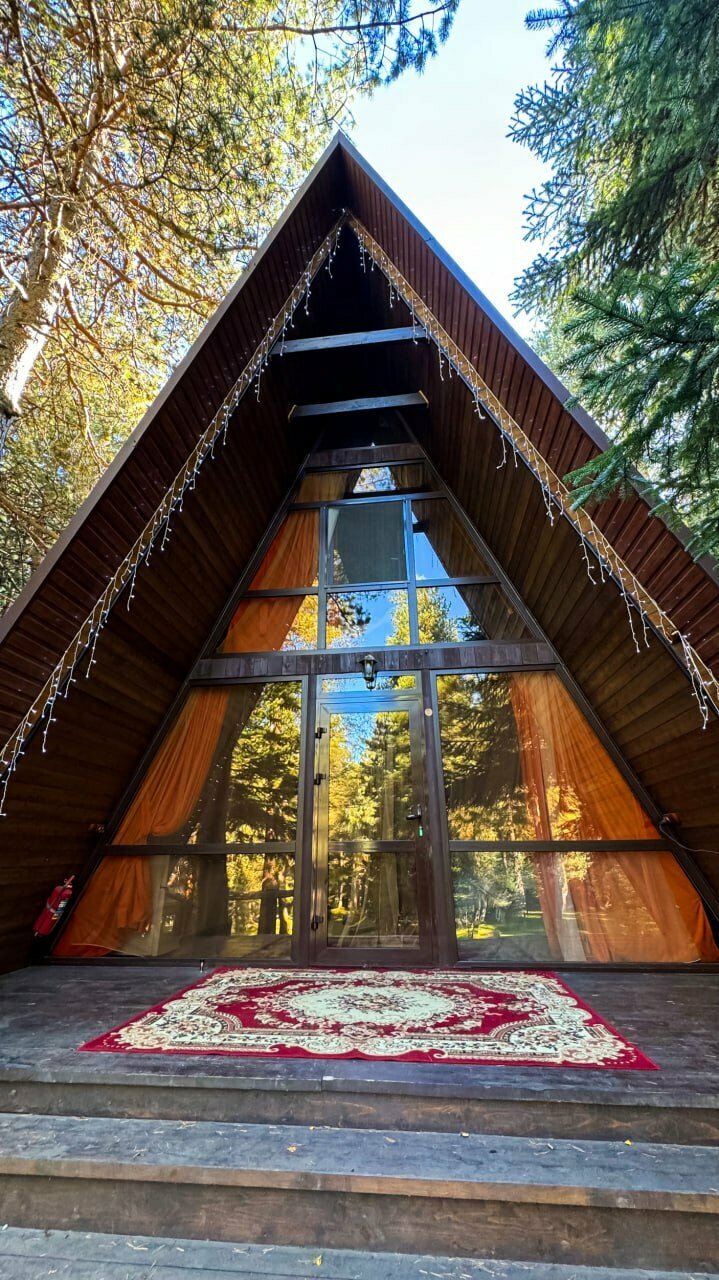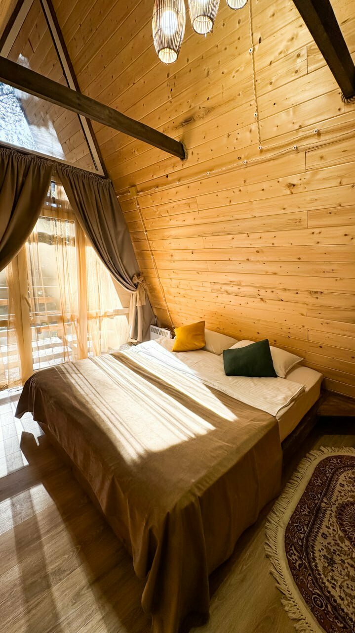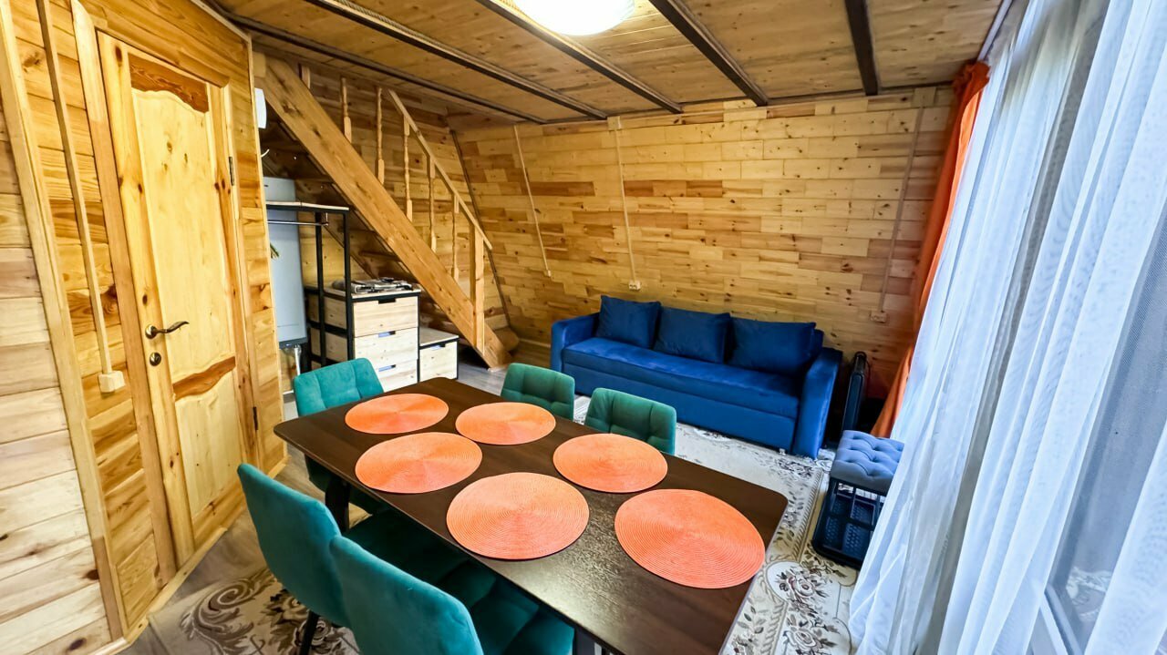 Треугольные домики, на 2 семьи, с двуспальный диваном на первом этаже и двуспальной кроватью на втором. Так же есть ещё одно спальное место - раскладное кресло на втором этаже. Для любопытствующих подойдёт домик с выходом на дорогу - целый день, кроме ночи приезжают квадрациклы, другие домики выход на другую сторону. У каждого домика есть беседка и на все домики место с костром с креслами - лежаками. Очень уютно. Самое спокойное и удобное место к основной дороге, неподалеку есть продуктовый магазинчик. В августе шишкопад, дорога песочная, пыльная, несколько раз в день увлажняют из шланга. Место одно из лучших.