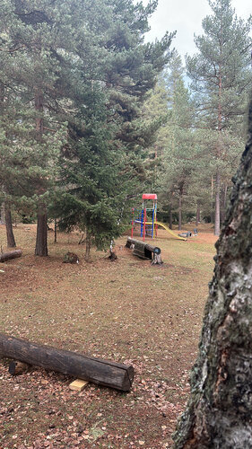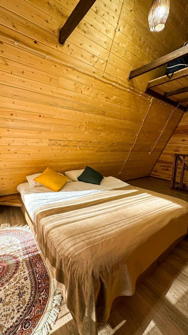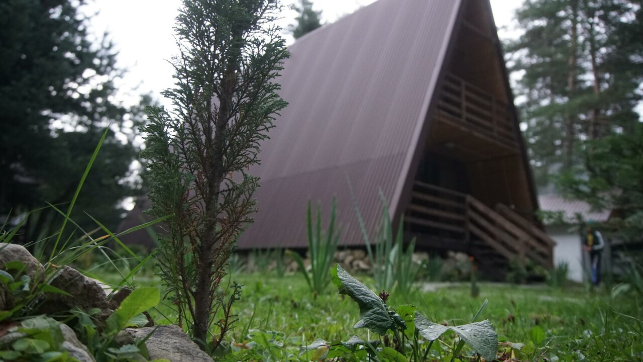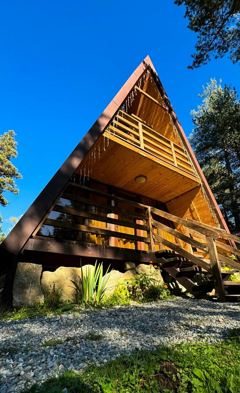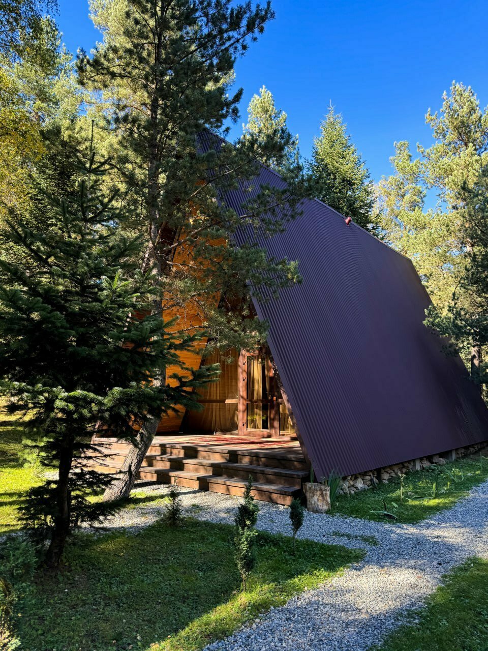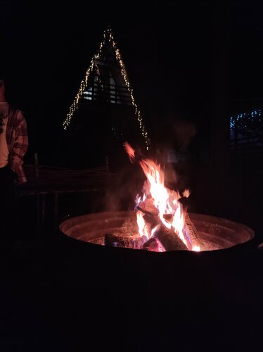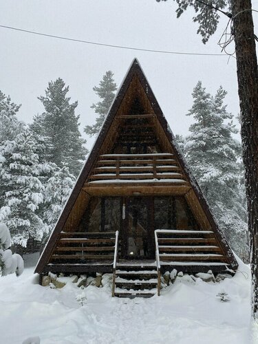 Треугольные домики, на 2 семьи, с двуспальный диваном на первом этаже и двуспальной кроватью на втором. Так же есть ещё одно спальное место - раскладное кресло на втором этаже. Для любопытствующих подойдёт домик с выходом на дорогу - целый день, кроме ночи приезжают квадрациклы, другие домики выход на другую сторону. У каждого домика есть беседка и на все домики место с костром с креслами - лежаками. Очень уютно. Самое спокойное и удобное место к основной дороге, неподалеку есть продуктовый магазинчик. В августе шишкопад, дорога песочная, пыльная, несколько раз в день увлажняют из шланга. Место одно из лучших.